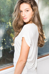 SUPER SOFT, NO SHEEN, MODAL QUALITY, CREW NECK CURVED BOTTOM TEE. ROUND NECK WITH A ONE INCH WIDE STRIP. ROLLED UP TACK SLEEVE DETAIL.