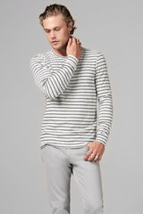 The waffle sweater is great for layering warmth or styling alone as a classic pullover. This sweater will keep you warm all winter long. The waffle woven material adds depth to a classic design. Self cuff arm hem and neckband. Slim fit throughout. The navy stripe sweater pullover is both seasonless and versatile.