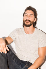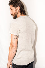 Relaxed fit, double raw edge detail at neckline, raw edge sleeve. Our thick knit novelty tee fabric. There's nothing like a great tee, it's a versatile garment you can wear on its own, or dress up with your favorite layer. Perfect as a base layer or alone.