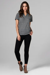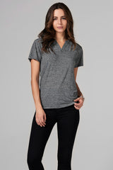 Cross V-neck tee,slim fit body, w/ double needle stitch hemmingat hem and sleeve.Wavy thin black stripe in heather grey ground.